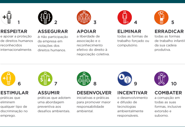 Os Dez Princípios derivam da Declaração Universal de Direitos Humanos, da Declaração da Organização Internacional do Trabalho sobre Princípios e Direitos Fundamentais no Trabalho, da Declaração do Rio sobre Meio Ambiente e Desenvolvimento e da Convenção das Nações Unidas Contra a Corrupção.